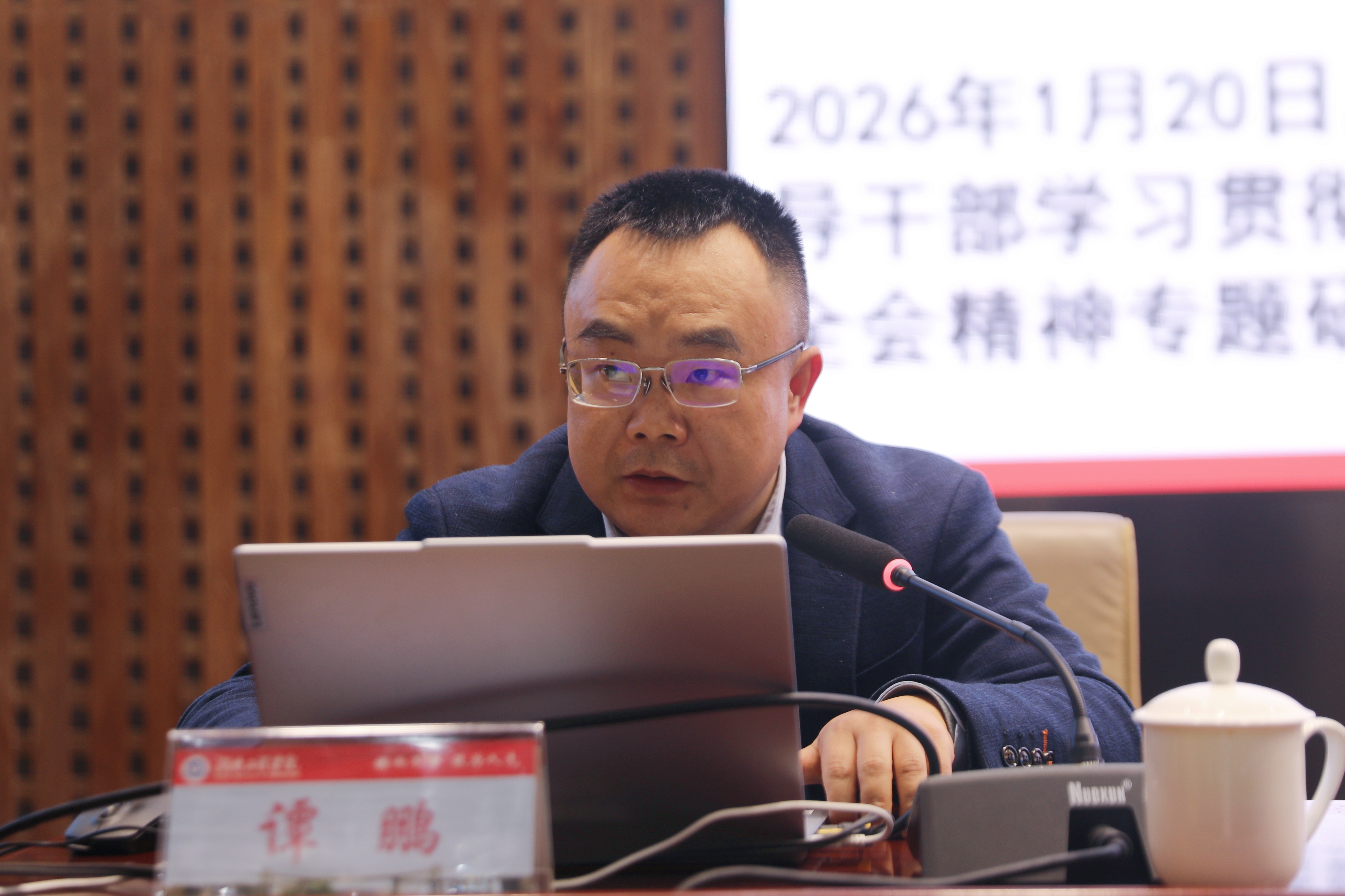 2月27日下午,我校深入学习贯彻党的二十届四中全会精神集中培训暨2026年第一期“卓越大讲堂”干部教育培训第三场报告会在一报告厅举行。湖南省委党校党史党建教研部副主任谭鹏应邀作专题辅导报告。这同时也是校党委理论学习中心组专题学习。全体在校校领导、中层干部、科级干部、专干、教研室(实验中心)主任及党支部书记参加学习。报告由校党委副书记向前主持。