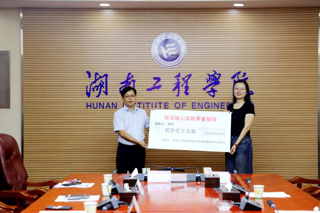 9月13日上午,我校电气楼311会议室内温情洋溢,一场简朴而庄重的爱心捐赠仪式在此举行。2005级建筑环境与能源应用工程专业校友胡欣向母校慷慨捐资25万元,设立“犀尧暖心”奖助学金,用于资助该专业家庭经济困难、品学兼优的学生。学术副校长丁选明,智慧建造与能源工程学院、校友联络中心负责人,胡欣校友的同窗好友徐纪昌、胡武文、谭阳等共同参加并见证仪式。