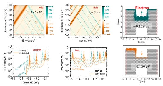 该研究提出了一种基于H型二硫化钼(MoS2)纳米带结构的几何调控自旋滤波新策略。作为典型过渡金属硫化物(TMDs),MoS2纳米带具有锯齿边和扶手椅边两种边缘构型,其中锯齿边通常呈现金属性与磁性,而扶手椅边则表现为半导体性与非磁性。研究通过交替排列这两种边缘构建双势垒势阱,约束离散量子化能级并诱导自旋依赖的共振隧穿。结果表明,在弱交换场下,该结构在电子与空穴输运中均可出现明显的自旋分裂共振峰和周期性自旋极化;随着交换场增强,自旋态能级分离进一步扩大,自旋滤波效率显著提升。该研究成果揭示了几何结构在调控自旋输运中的关键作用,为发展低功耗自旋滤波器、自旋逻辑门及其他量子器件提供了新思路。