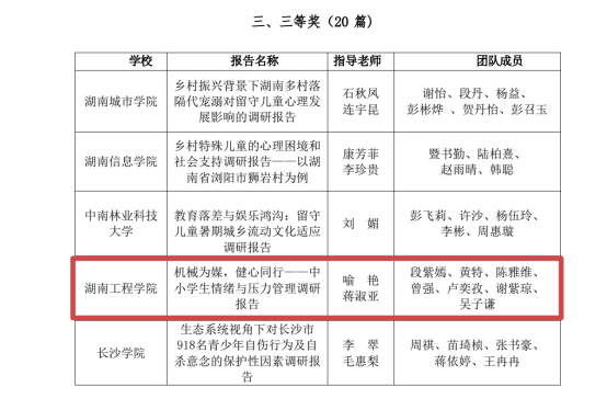 近日,第四届湖南省高校“健心践行”暑期社会实践调研报告评选结果公布。我校机械工程学院提交的《机械为媒,健心同行——中小学生情绪与压力管理调研报告》获三等奖。
