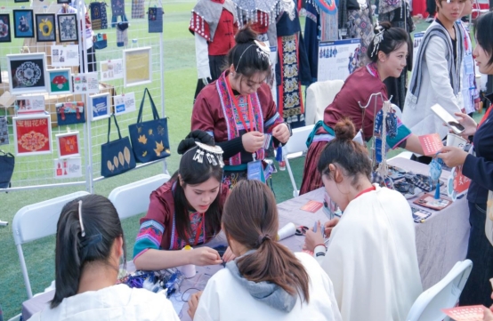 我校围绕“守侗织匠心,筑民族之美”主题,组织选送了多项特色内容参展,包括运用人工智能技术辅助创新设计的侗族织锦服饰,以及融合侗锦传统技艺与现代纺织工艺的织锦纹样装饰品。展区设置了民族风文创手工互动环节,吸引众多参观者现场体验传统土布手工文创产品的制作过程。展出的民族风手工艺品受到广泛欢迎,参与互动体验的学生络绎不绝。大家普遍反馈,沉浸式体验活动富有意义,既学习了基础手工技能,也深切感受到侗族织锦的独特文化魅力。