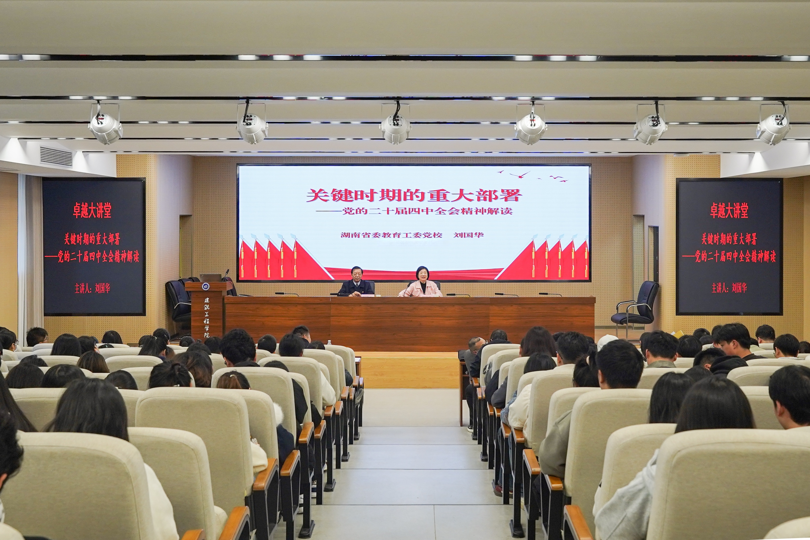 为深入学习贯彻党的二十届四中全会精神,12月19日下午,智慧建造与能源工程学院召开学习贯彻党的二十届四中全会精神专题宣讲报告会。会议特邀湖南省委教育工委党校刘国华教授作题为《关键时期的重大部署——党的二十届四中全会精神解读》的专题辅导报告。报告会由学院党委书记施晓蓉主持,学院全体教职工及学生代表共计400余人参加学习。