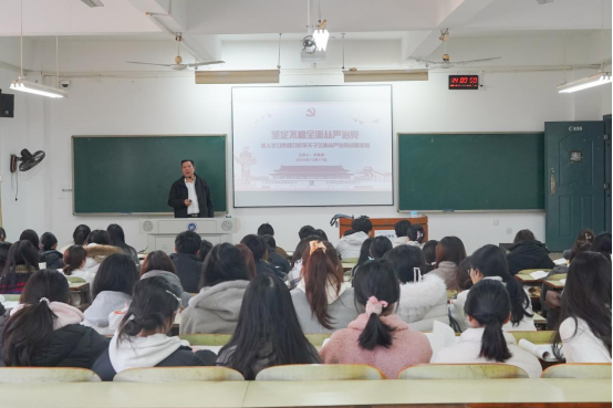 为推动党的二十届四中全会精神入脑入心,12月17日下午,校党委委员、纪委书记齐路良以《深入学习贯彻习近平总书记关于全面从严治党战略思想》为题在1教C栋406教室为商务英语2403-2405班学生讲授了一堂主题鲜明、内容深刻的思政课。