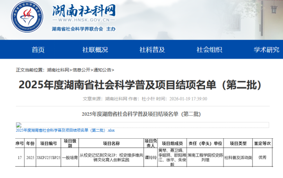 近日,从湖南省社会科学界联合会传来喜讯,我校校史陈列馆省级社科普及基地团队承担、图书馆(档案馆)副馆长谭玲玲主持的《从校史记忆到文化IP:校史馆多维共铸文化育人创新实践》项目,顺利通过2025年度湖南省社会科学普及项目结项评审,获评“优秀”等级。