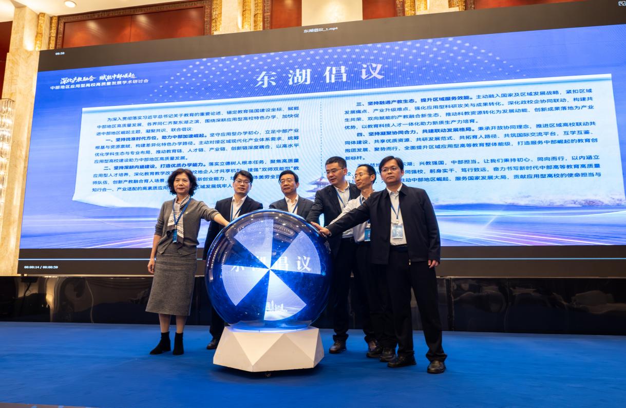 会议发布了应用型高校发展《东湖倡议》。《东湖倡议》提出:坚持找准时代方位,助力中部加速崛起;坚持深耕内涵建设,打造优质办学能力;坚持融通产教生态,提升区域服务效能;坚持凝聚协同合力,共建联动发展格局。
